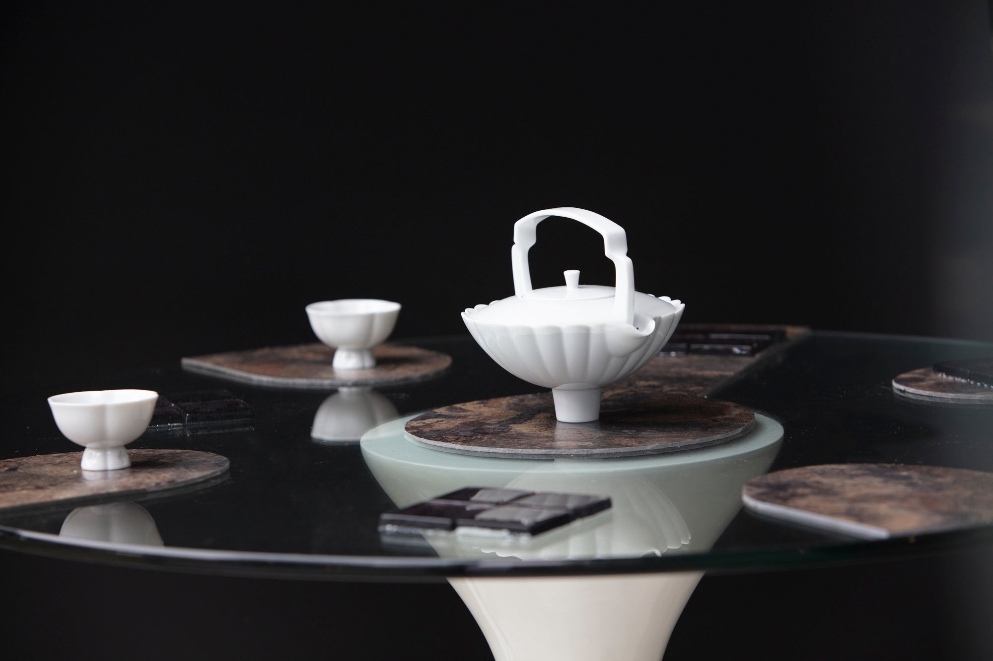 於是一改傳統人文書卷雅緻意象的桌上風景,變奏為都會恭整自律的知性構成,從自然樸質的親切材質和線性結構的優雅舖陳,跳入人工高光的冷淡肌理和片段零碎的幾何佈局,懷著時下熟悉的環境現實和美感體驗,展開從壺身到桌面,一場品茗傳承和轉型新的故事情節。